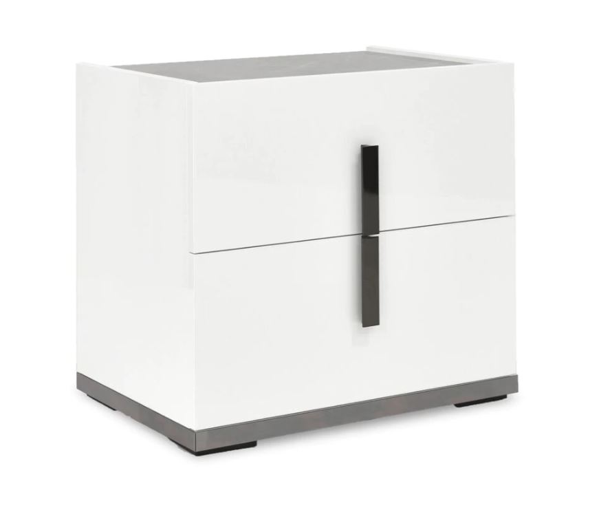 - Pristine high gloss white acrylic lacquer is paired with grey faux Carrera marble and chrome accenting for a high class contemporary look