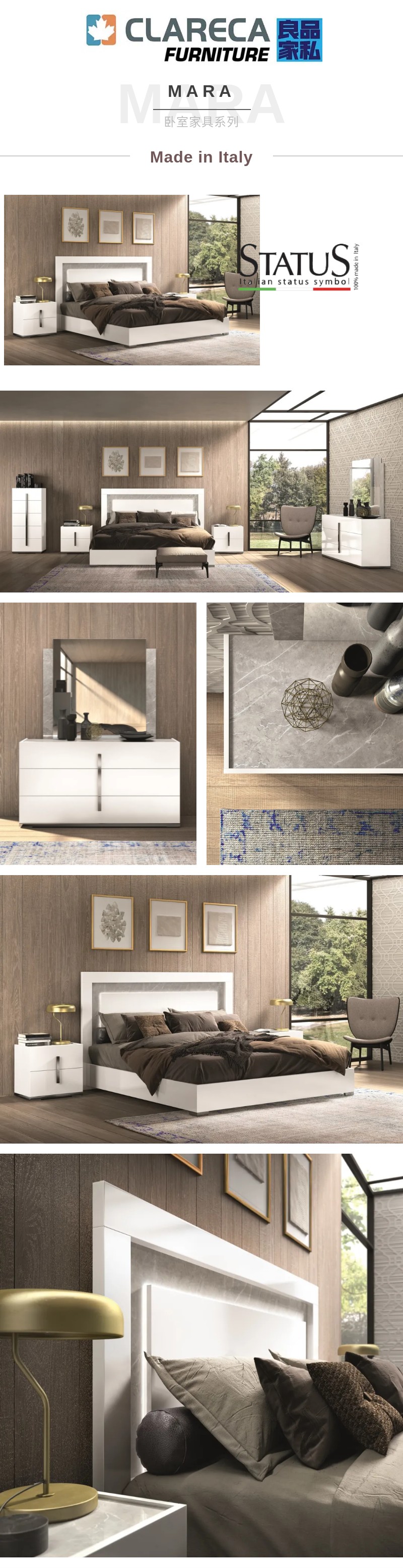 - Contemporary white panel headboard with grey faux Carrera marble inlay and built-in LED lights controlled by integrated on/off sensor panel